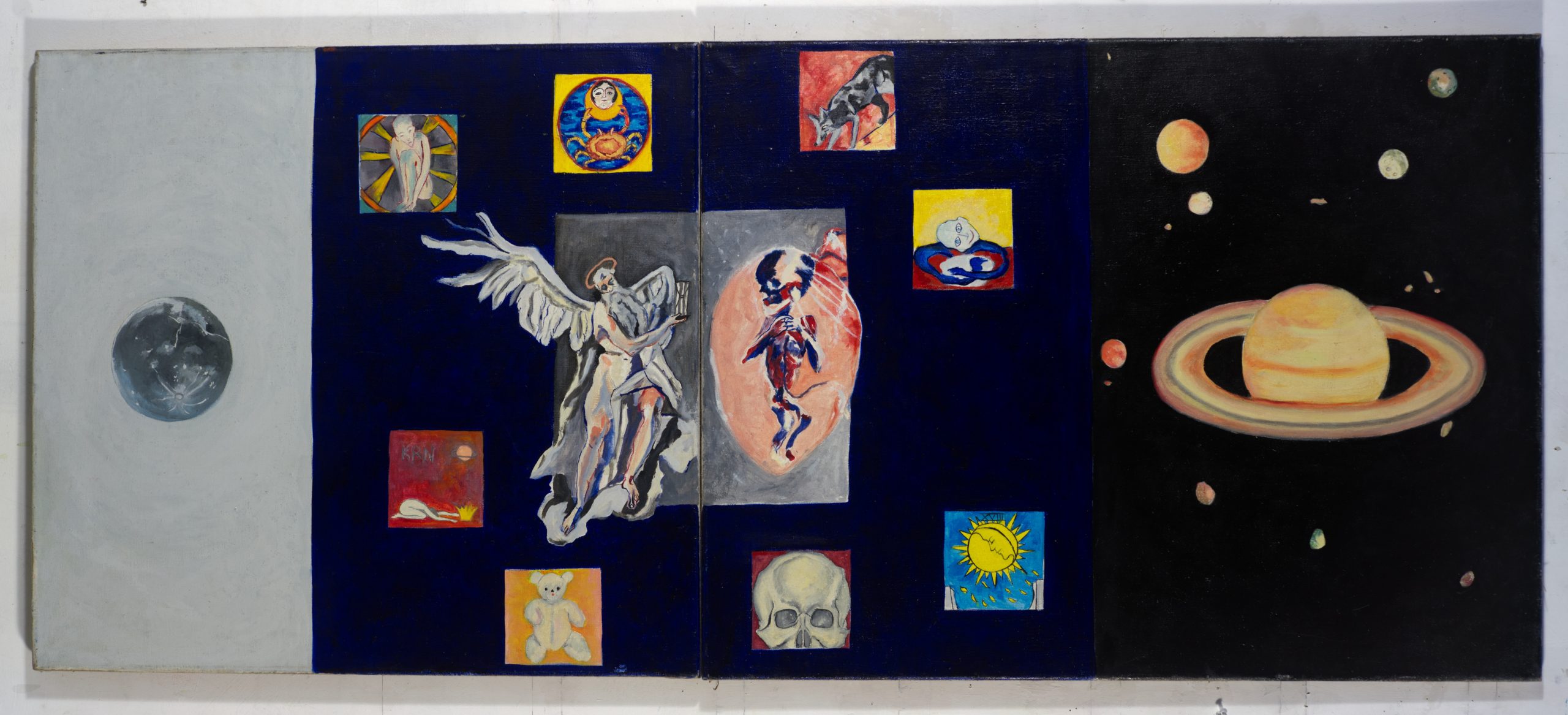 At the center of the diptych, the Moon and Saturn are embodied as human figures, forming a couple suspended between closeness and distance. The Moon evokes sensitivity, memory, and cyclical time, while Saturn represents structure, gravity, limitation, and endurance. Their encounter suggests a fragile equilibrium between emotion and form — an ongoing negotiation rather than a resolution.
